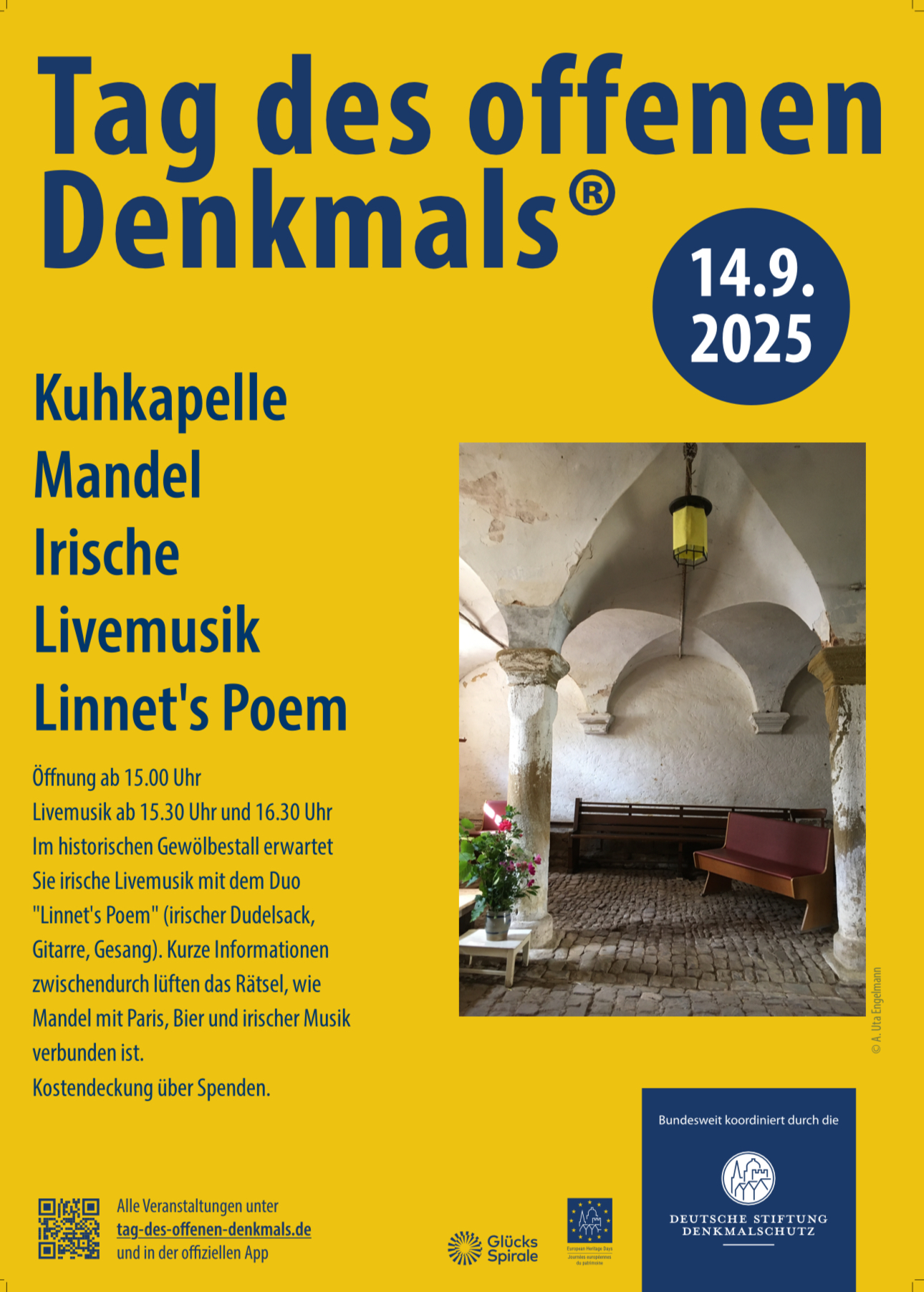 In der historischen Kuhkapelle Mandel wird irische Livemusik gespielt vom Duo Linnet’s Poem (irischer Dudelsack, Gitarre, Gesang). Informationen zum Denkmal mit Bezug zum Motto des Tags des offenen Denkmals werden zwischendurch gegeben. Es gibt im Hof einen Getränkeausschank und Brezeln zur Erinnerung an die Braugerstentradition des Hofes.
